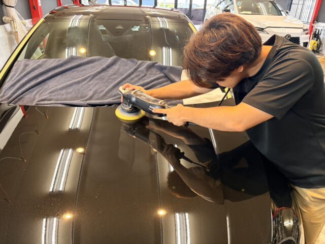 最後の仕上げとして鏡面研磨を行い、ライトを当てないと見えないような微細な線傷まで消し込むことで、圧倒的な艶と光沢を実現します。この下地処理は仕上がりに直結する最も重要な工程です。同じガラスコーティングでも、ディーラーやカーショップ、専門店によって耐久性や見た目に大きな差が出るのは、この下地処理の内容やスタッフの技術力に違いがあるからです。