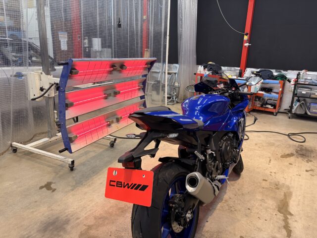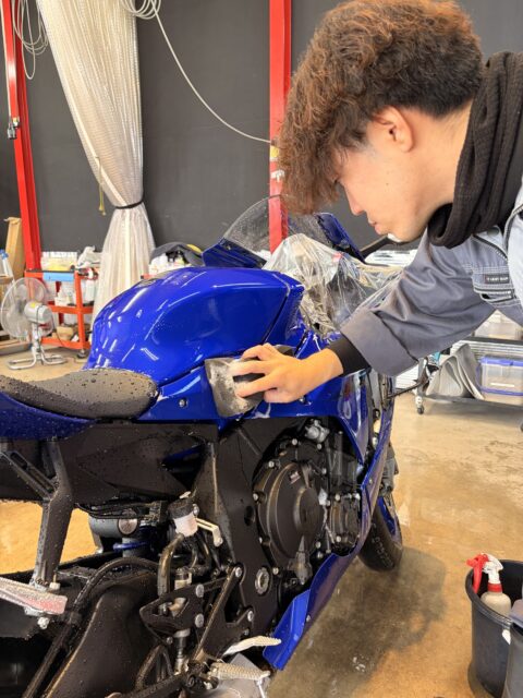 今回は、和歌山県和歌山市よりお越しいただきましたお客様のバイク、YAMAHA・YZF-R1にGガードガラスコーティングを施工しました。、今回はバイクを長くきれいな状態で乗り続けたいということでご依頼いただきました。