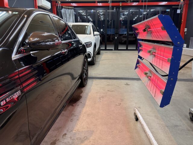 脱脂洗浄後は湿度・温度が管理された専用ルームにてコーティングを塗布していきます。細かい隙間や複雑な形状の箇所まで均一に塗布できるよう専用のスプレーガンを使用しながら丁寧に作業を進めていきます。拭き残しやムラをチェックした後は乾燥工程へと移るのですが、当店では熱乾燥装置を使用しております。