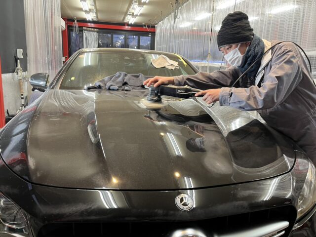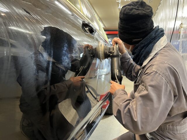 ボディの汚れや不純物を除去した後は、ボディ全体の傷やシミを徹底的に磨いていきます。まずは丁寧にマスキングテープで磨けない部分を保護し、傷の深さや状態に応じて研磨剤や機器を使い分けながら作業を進めます。磨き工程は複数段階に分かれており、まずは大きな傷を処理し、その際に発生する磨きキズをさらに細かい研磨剤で取り除いていく流れです。