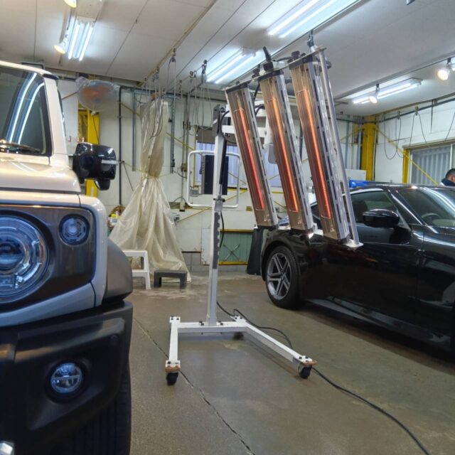 脱脂洗浄後は湿度・温度が管理された専用ルームにてコーティングを塗布していきます。細かい隙間や複雑な形状の箇所まで均一に塗布できるよう専用のスプレーガンを使用しながら丁寧に作業を進めていきます。拭き残しやムラをチェックした後は乾燥工程へと移るのですが、当店では熱乾燥装置を使用しております。