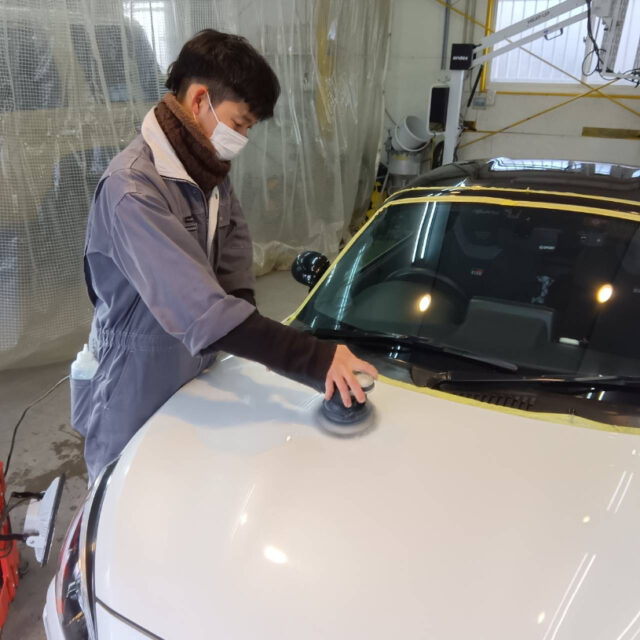 ボディの汚れや不純物を除去した後は、ボディ全体の傷やシミを徹底的に磨いていきます。まずは丁寧にマスキングテープで磨けない部分を保護し、傷の深さや状態に応じて研磨剤や機器を使い分けながら作業を進めます。磨き工程は複数段階に分かれており、まずは大きな傷を処理し、その際に発生する磨きキズをさらに細かい研磨剤で取り除いていく流れです。