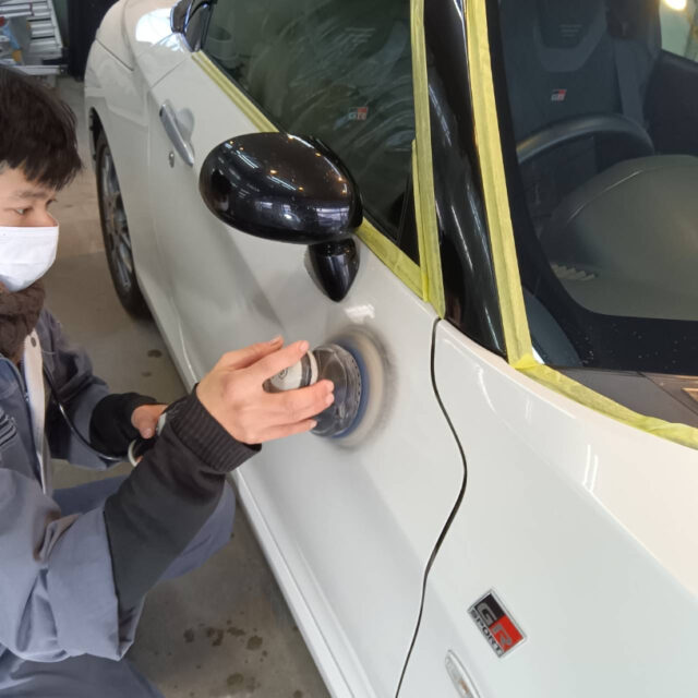 ボディの汚れや不純物を除去した後は、ボディ全体の傷やシミを徹底的に磨いていきます。まずは丁寧にマスキングテープで磨けない部分を保護し、傷の深さや状態に応じて研磨剤や機器を使い分けながら作業を進めます。磨き工程は複数段階に分かれており、まずは大きな傷を処理し、その際に発生する磨きキズをさらに細かい研磨剤で取り除いていく流れです。