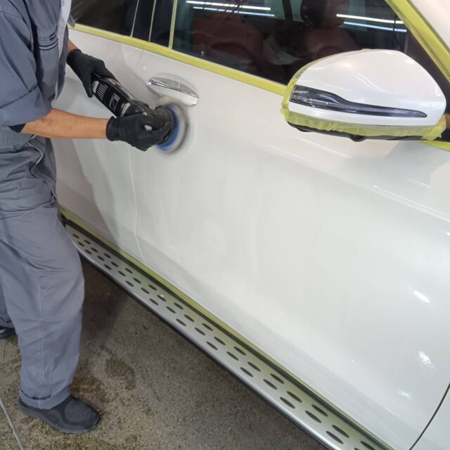 ボディの汚れや不純物を除去した後は、ボディ全体の傷やシミを徹底的に磨いていきます。まずは丁寧にマスキングテープで磨けない部分を保護し、傷の深さや状態に応じて研磨剤や機器を使い分けながら作業を進めます。磨き工程は複数段階に分かれており、まずは大きな傷を処理し、その際に発生する磨きキズをさらに細かい研磨剤で取り除いていく流れです。
