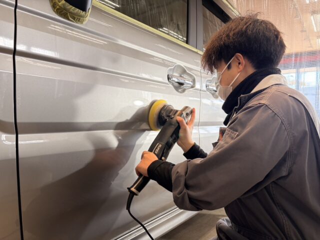 ボディの汚れや不純物を除去した後は、ボディ全体の傷やシミを徹底的に磨いていきます。まずは丁寧にマスキングテープで磨けない部分を保護し、傷の深さや状態に応じて研磨剤や機器を使い分けながら作業を進めます。磨き工程は複数段階に分かれており、まずは大きな傷を処理し、その際に発生する磨きキズをさらに細かい研磨剤で取り除いていく流れです。