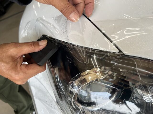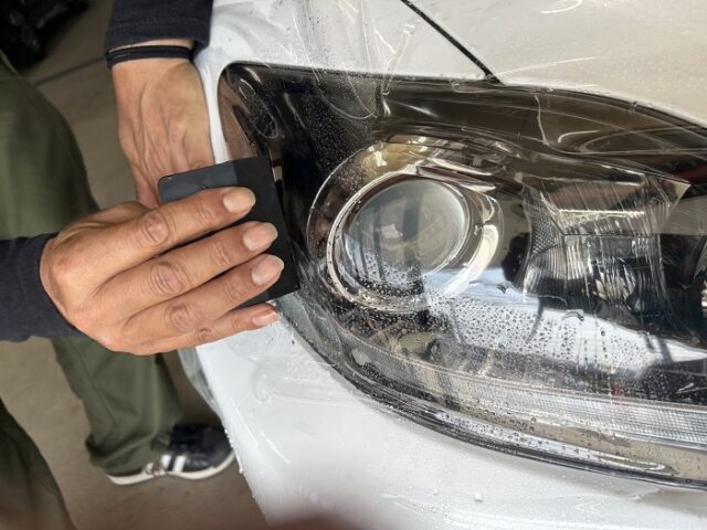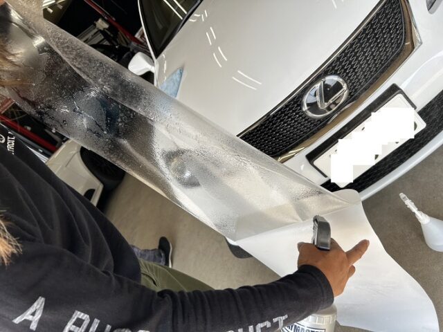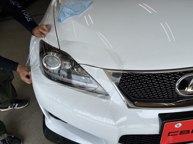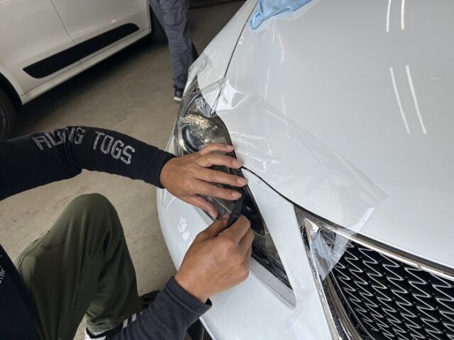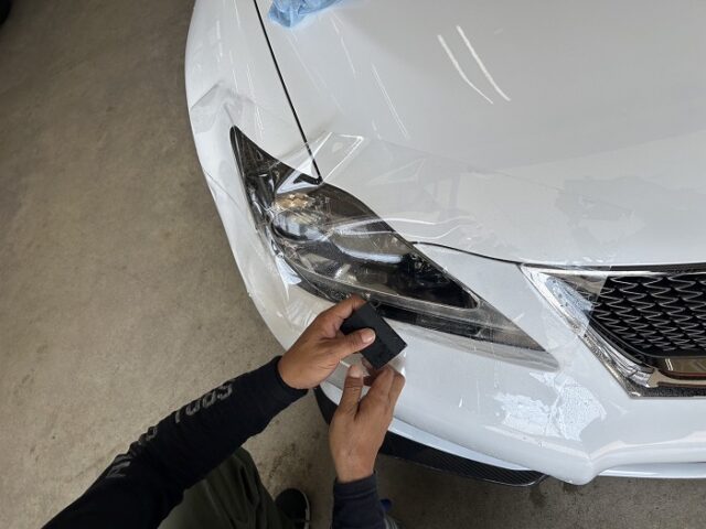 今回は、レクサスISのヘッドライトに透明のプロテクションフィルムを施工しました。