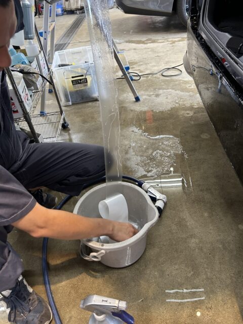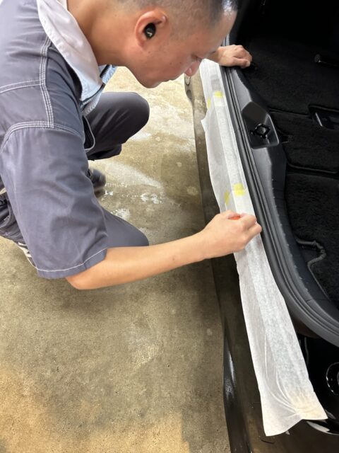 貼り付けの作業ではまずセパレーターをめくりフィルムをバンパーにのせて施工液を抜いて固定します。